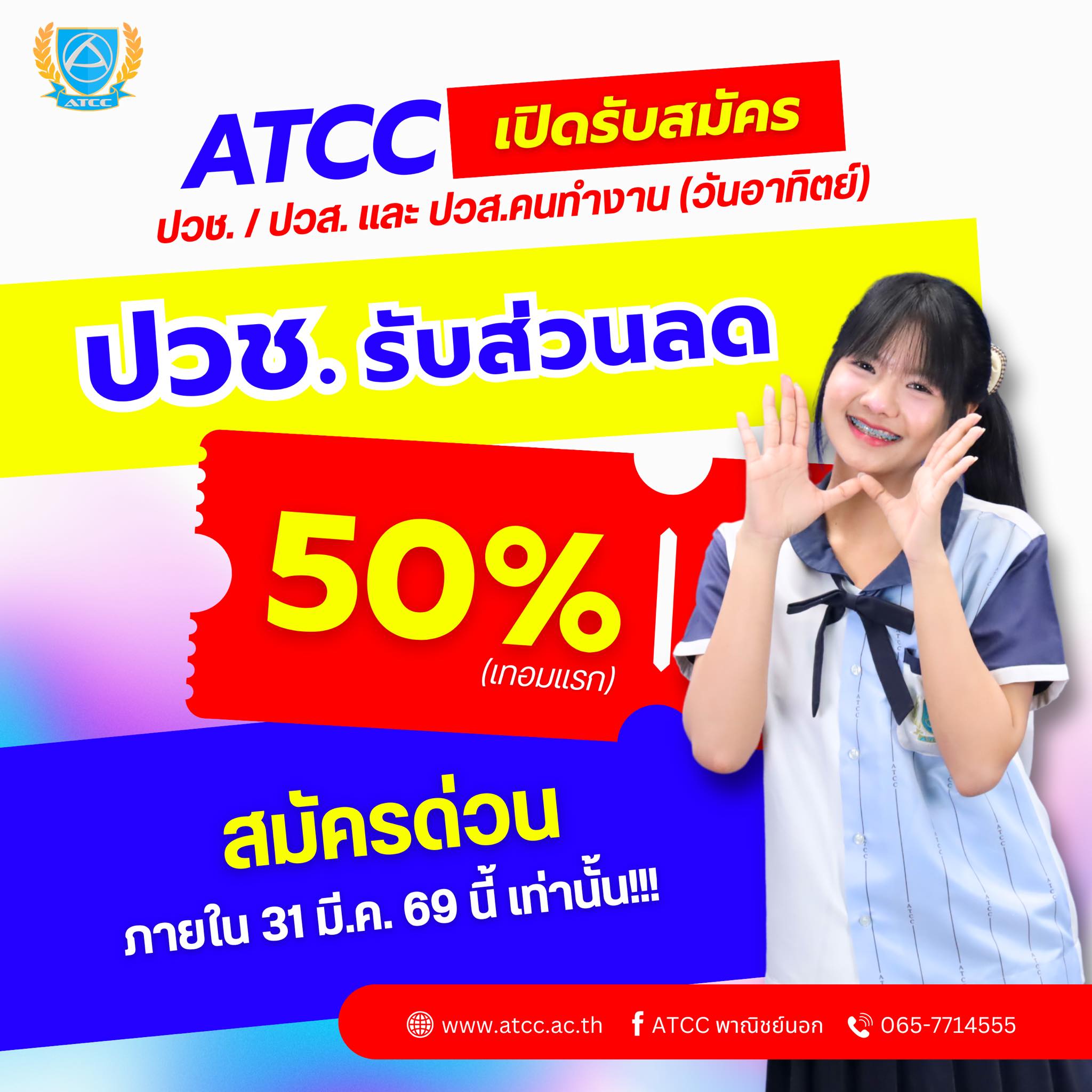 🎓 อยากมีอาชีพเร็ว มีทักษะจริง เริ่มต้นที่นี่! 📢 ATCC พาณิชย์นอก เปิดรับสมัครนักศึกษาใหม่ ระดับ ปวช. / ปวส. และ ปวส.สำหรับคนทำงาน (วันอาทิตย์) ✨ สมัครง่าย ไม่ต้องสอบเข้า ✅ ค่าเทอมถูก ผ่อนชำระได้ ✅ กู้เรียนได้ มีรายเดือนให้ใช้ 3,000 บาท ✅ ฟรี! ประกันอุบัติเหตุ ตลอดการศึกษา ✅ เรียนจบมีงานทำ ✅ มีกิจกรรมสนุกๆ และ คอนเสิร์ตให้นักศึกษา ฟรี!! 🔥 พิเศษสำหรับ ปวช. รับส่วนลดค่าเทอม 50% (เทอมแรก) ⏰ สมัครด่วน ภายใน 31 มีนาคม 2569 เท่านั้น 👉 สมัครเรียนคลิก https://forms.gle/Riq1uUT9GSdZTdmK8 👉 สอบถามข้อมูลสมัครเรียนได้ตลอด 24 ชม.📳 👉 สอบถามได้ที่ LINE : https://line.me/R/ti/p/@694lgklh 📲 โทรสอบถามข้อมูลเพิ่มเติม : 065-7714555 🌐 เว็บไซต์ : www.atcc.ac.th *เงื่อนไขเป็นไปตามที่วิทยาลัยกำหนด