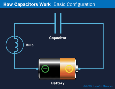 ตัวเก็บประจุเข้ากับวงจรไฟฟ้าอย่างง่าย โดยแบตเตอรี่จะจ่ายไฟให้แก่ตัวเก็บประจุ