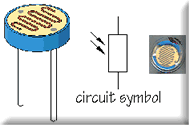 3) ตัวต้านทานไวแสง หรือ แอลดีอาร์ ( LDR ) ย่อมาจาก Light Dependent Resistor เป็นตัวต้านทานปรับค่าได้ โดยค่าความต้านทานขึ้นอยู่กับปริมาณแสงที่ตกกระทบ ถ้าแสงที่ตกกระทบมีปริมาณมาก LDR จะมีค่าความต้านทานต่ำ ซึ่งสัญลักษณ์ที่ใช้ในวงจร คือ